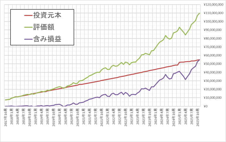 表を見てて気づきましたが、投資してきた累計元本≒含み益となりました。